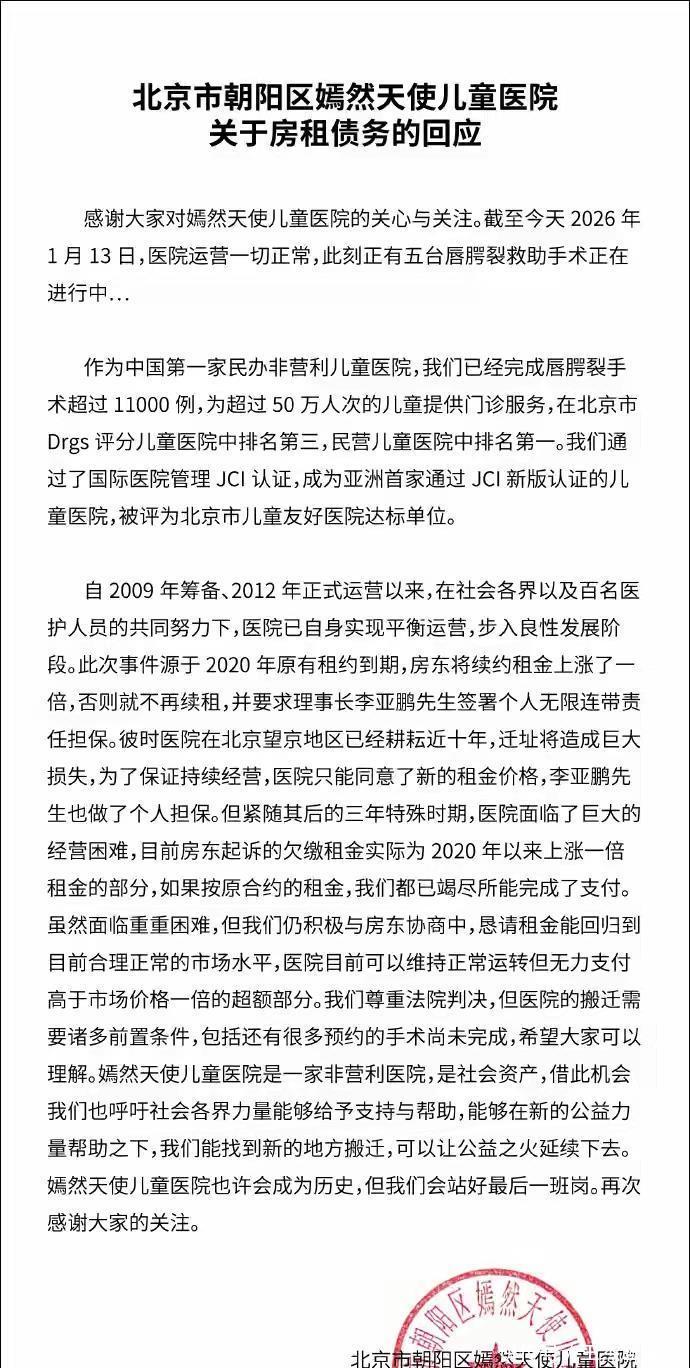 李亚鹏最终还是没跑过债主的追讨,不得不低头认输。就在2026年1月13日这天,他在社交平台上公开回应了关于嫣然天使儿童医院的房租债务问题,言语间满是无奈,声称“不得不接受事实,16年了,尽力了”。这家曾经备受瞩目的公益医院,如今不仅拖欠了巨额房租,甚至面临着被法院强制腾退、成为历史的尴尬境地。